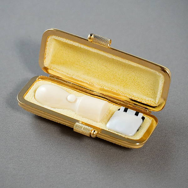 天丸と呼ばれる中央がくびれた美しい形が特徴で、上下の印にはいずれも象牙が使用されています。