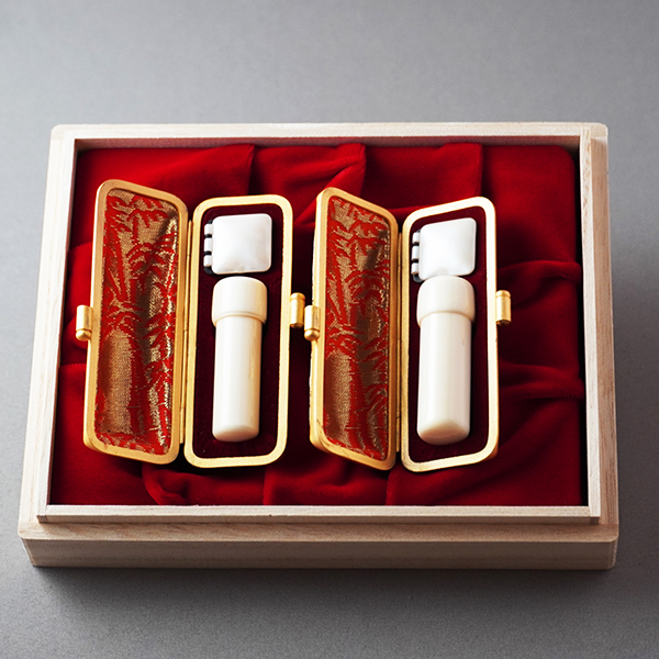 実印・銀行印・に最適な、金鶴亀ケース入り象牙(上上)45×15ミリ丸実印+45×13.5ミリ銀行印2本セットです